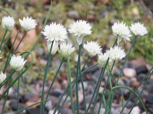 ARID LAND PLANTSAllium sp. (still to be ID’d... may be Allium maximowiczii ssp. shibutsiense 'Alba') With very light bright blue tubular, fistulous foliage and white flowers this yet to be identified onion is one we like so very much we’re offering it though we do not yet know its name! It mimics the look of well-known chives (A. schoenoprasum) though it is a tad shorter in stature. Showy, luminous tear-shaped buds, white and barely touched with Granny Smith apple green, float like glowing phosphorescent lanterns above the blue arching foliage. The pure white chive flowers follow in June. The foliage remains quite blue all through the growing season. This is a beautiful species! The size, characteristics and look fits the parameters of the alpine subspecies of A. maximowiczii. Site this fantastic ornamental onion in fertile, well-draining soil in plenty of sun where it will delight you with late spring flowers bobbing above its handsome blue foliage. It has not been a self-sowing nuisance at Quackin’ Grass. If ordered in autumn your Allium will arrive as dormant potted bulbs.