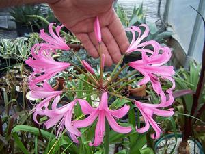BULBSAmarine tubergenii 'Zwanenberg' (ex: Ellen Hornig) - The enormous brilliant pink dome of Nerine-like flowers looks as if this exceptional hybrid is on steroids. The splendid flowers radiate from the top of the fleshy stem erupting from the bulb with very much the look of the Amaryllis parent. This child from the cross between Nerine bowdenii and Amaryllis belladonna made in 1968 was raised and selected by Van Tubergen. Yes, hard to ignore the "Tuber" in Tubergen. 'Zwanenberg' blooms late season into the autumn here... of course, we keep ours in an old-fashioned terra cotta pot for added moisture dissemination which is important for all South African bulbs it seems... Drainage, drainage drainage! Foliage is a intermediate cross between the narrower straps of the Nerine parent and the broader belts of those of the Amaryllis. A knockout both in the garden or in the conservatory and greenhouse where landscape application is an anathema. They do not like disturbance, so treat gently and if / when transplanting is necessary do so just as the new season's growth begins to emerge from the top of the bulb... think Amaryllis. Even then set back is possible. However, this is a most worthy hybrid, a definite must for those who love this complex. And, of course, keep it drier in winter when dormant. Established pot grown bulb(s).