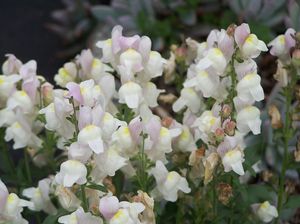 QUACKIN' GRASS INTRODUCTIONSAntirrhinum hispanicum 'Blushing Dragons' EXCLUSIVE - The flowers are white with the barest blush of pink on the pouch rising from June to frost above fuzzy gray-green foliage. Plant it in full blazing sun in very well-drained conditions. Clumping. In the north plant it in the spring. Cutting grown.