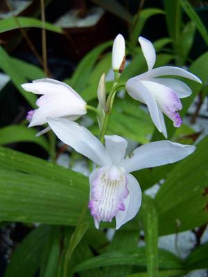 BULBSBletilla striata var. alba 'Variegata' – White orchids float above attractive pleated broad swords of leaves sporting white leaf margins. Though we have listed a hieght of 18 to 24 inches in the happiest circumstance your Urn Orchid may rise to 30-inches. Site your Urn Orchid in afternoon shade planted in fertile moisture retaining soil to which organic matter has been added. Once established Bletilla demonstrates some drought tolerance. In the north be certain to plant Bletilla striata at least 4 inches deep. 'White Pearl' is clumping with quicker increase than other cultivars. An organic mulch will be beneficial. Established pot-grown orchid via division.