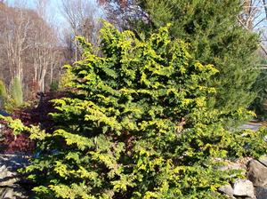 CONIFERSChaemaecyparis obtusa 'Fernspray Gold' – An outstanding filiformis cultivar of Hinoki Cypress believed long lost to the trade surfaced, fortunately for us, in New Zealand. The arching branches, held nearly horizontal, radiate from the central trunk(s). Each elongated flattened branch mimics a heavily ruffled and gilded fern frond. The golden scale-like foliage shades to a rich dark green at the interior of the shrub. The green darkens in winter as the yellow burnishes to a golden orange. ‘Fernspray Gold’ develops very bright yellow foliage in full sun, greener-gold in half shade. Fertile draining soil. Cutting grown. For northern gardeners these are best planted during the spring window and not in autumn... for southern gardeners there are greater possibilities but know your zone and what is genuinely feasible. These have stretched so we may prune the tops so that they begin to bush and thicken in your landscape. Please read the Genus Overview below.