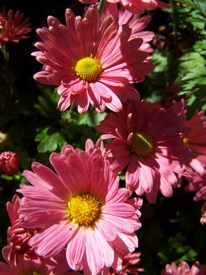 SUN PERENNIALSChrysanthemum "hardy coral pink single" - We suspect this is a named selection but really don't know. "Hardy coral pink single" is a late-bloomer with a sunny yellow button center of each medium-deep coral pink daisy-like flower, very pretty. It was on the property when we moved here in 1999 adjacent to what is presently our customer parking. I transplanted it and have been propagating it for years now. It's been tough as nails here in USDA zone 5b, the bees love it and so do we. We suspect that it would sell better if it had a cute name... this is a beauty of a hardy mum, named or not! Cutting grown. All of our cultivars are propagated by cuttings and are pot-grown.