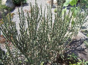 ARID LAND PLANTSCylindropuntia imbricata (ex: Bob Bonneville) – We've had this especially hardy form of Stick Cholla, Cane Cholla or Tree Cholla in our full sun stone garden since 2000. Only in the harshest winters do any of its spiring stems suffer. But when temperatures warm it recovers beautifully, Many winters do not touch it and it enters the new season looking as good as it did at the end of the previous. We've tried other forms and all have melted to thorny mush, even during gentler winters. We do not know where Bob acquired this plant but its hardiness is noteworthy. Certainly it is from a more northern population and / or a population from a high elevation. Stick Cholla is great contrast to Opuntia fragilis and the many larger Beaver Tail Cacti. It's spectacular among boulder and yuccas. Were it that we could grow Agaves with our Cylindropuntia imbricata; but alas, we're just a bit too wet coupled with the freezes and thaws of late winter for the Agaves - but that's another tale. Pink-purple flowers are scant in late spring into early summer but that's not why we grow it; rather it's for architectural dark green silver-spined steeples en masse. Full, blazing sun and, of course, a quick draining planting condition. Established potted Stick Cholla from cutting.