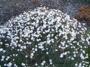 ARID LAND PLANTSDianthus arenarius 'Snow Flurry' - Saturated gray-blue mats of dense foliage hug the ground and give rise to pure white single flowers with fringed petals. Buds rise on stems from 6 to as tall as 10 inches. The fringed white flowers are lovely. The gray foliage looks great all season, a garden throw rug between 1 and 3 inches tall 'Snow Flurry' will also be beautifully utilized draping over a wall. It is in striking, dynamic contrast to the larger bold and architectonic Opuntia. Perfect in the full sun rock garden planted in average to impoverished soil it has been a doer for us at Quackin' Grass providing showy June flowers on a slowly ever-increasing span of fine evergreen foliage that is virtually weed-proof. A draw to bees and butterflies Dianthus arenarius 'Snow Flurry' is deer resistant. Its species common name is Sand Pink which should give you a clue as to its cultural prerequisite: full sun in a well-drained, gritty calcareous mix - be sure to add that dolomitic limestone! Your efforts will be foiled if planted in a rich mix. Established pot grown perennial from division.