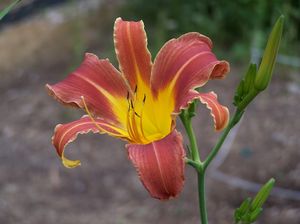 DAYLILY (HEMEROCALLIS)Hemerocallis ‘Challenger’ - Yet another wonderful Arlow Stout intro made in 1949. Classically-shaped flowers of medium ruddy brick red with a golden heart and creamy-yellow midribs bloom over a long season. Flowers remain open for 16 hours. The photo with Professor Jonathan Lehrer indicates the heights to which this daylily may grow. Jon stands 6' 3" tall.