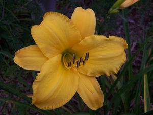 DAYLILY (HEMEROCALLIS)Hemerocallis 'Mohawk Honey' (Davis) – Look: there are a plethora of yellow daylilies available but then there are YELLOW daylilies. 'Mohawk Honey' is truly exceptional. Incredible deep, saturated yellow memorializes the nostalgia of the butter color on old-fashioned movie house popcorn. The rich shade pops and demands attention in the July garden. The color is so rich and intense yet still manages to be bright. Though the flower opens with just a touch of lime green at the heart as petals stretch and the blossom attains its 6-plus inch full size by midday the green fades and there is no other color apparent; from the heart to the petal tips, even the anthers are the very same shade. On hot afternoons the barest infusion of peach in the yellow may appear on the three sepals. It is only ascertained on very close inspection; it may not appear at all and is hardly worth mentioning. Midribs on close inspection exhibit a slight lighter color but standing but a few feet away it is not noticeable. Monochrome, a beckoning beauty, 'Mohawk Honey' is also a good increaser with a good bud count. This is the only daylily we have from the late Shirley Davis, our local daylily expert who through the years bred approximately 24 cultivars she felt worthy of a name. She always felt lukewarm about her efforts and reticent may have underestimated her abilities. Then again there are a ridiculous number of cultivars out there already, a fact of which she was not unaware. Unfortunately, she is no longer with us. And also unfortunate for all of us is that before Shirley was able to follow through with the verbal agreement that we forged that would open the way for Quackin' Grass to introduce and offer her collection to a larger audience she quickly succumbed to a virulent cancer. We miss you Shirley. Though we fear it will come to pass we hope that your collection will not be lost. xxx