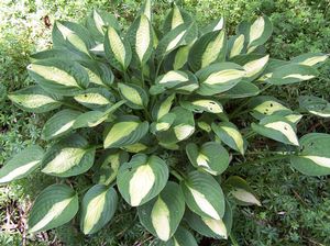 HOSTAHosta 'Gypsy Rose' – A distinct and clearly demarcated creamy white to creamy yellow central eye is surrounded by wide dark green margins on this very showy cultivar with variable subtle streaking where the white meets the green. Lavender flowers in late summer. 'Gypsy Rose', a sport of 'Striptease', is a beauty! Size: 14 to 16 inches x 20 to 24 inches, scapes: up to 36 inches.