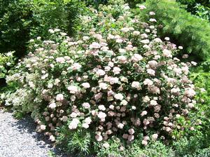 DECIDUOUS SHRUBSHydrangea arborescens ‘Eco Pink Puff’ (ex: Don Jacobs) – This is a remarkable pink flowering shrub. The foliage is much smaller than the other ovate leaf forms offered here. Interestingly, the tight, densely-packed tiny florets composed into corymbs take on an almost layered and refined Joe-pye weed appearance, almost like an artist's rendition of mounded clouds reflecting pink at sunset. Many who have seen it thought it was a Joe-pye weed… or were downright baffled! This plant has recently been the breeding subject in development of new pink panicle hydrangea cultivars. But we very much like this one much with its simple, clean and very handsome appearance – closer to species with its unusually formed flower heads. ‘Eco Pink Puff’ is fantastic in the mixed shrub border or used as a backdrop to shorter perennials. And it remains attractive for multiple seasons as 'Eco Pink Puff' hangs onto its corymbs in the winter landscape, now dried over tough stems in warm medium brown that withstand heavy snows. It will be conversation piece for many, many weeks with its extensive flowering period in summer. Plant Hydrangea arborescens ‘Eco Pink Puff’ in fertile soil sited in full to three-quarters sun for best performance.