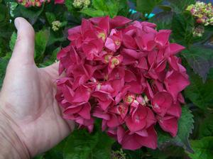 Hydrangea macrophylla ‘Brunette’ (ex: Jonathan Lehrer) – 'Brunette' aka 'Merveille Sanguine' is a compact beauty cloaked in very deep dark, glossy green foliage. Leaves are of especially heavy substance. Showy mop heads in deep red-pink darken in color as they age. In late season the magnificent leaves turn glossy brownish bronze and are usually infused with glowing red. Wow! This is a great mop head. ‘Brunette’ blooms on old wood.