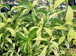 SHADE PERENNIALSLeucoseptrum japonicum ‘Variegatum’ (probably the same as 'Mountain Madness') – Leaves, much narrower than the species, are nevertheless broader than the two angel forms. The showy gold splashes are bold, irregular, and mature to creamy white starkly contrasted with the remaining dark green of each leaf. Byron W. from Long Island tells us that they are very good late season bee plants. In autumn these may arrive pruned.
