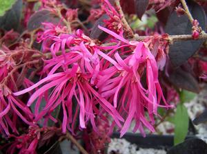 DECIDUOUS SHRUBSLoropetalum chinense var. rubrum 'Zhuzhou Fuschia' - Deep, dark maroon-black lanceolate foliage cloaks this beautiful shrub all season long.Hot, bright candy pink flowers composed of thread-like petals heavily stud the shrub in late spring with some sporadic bloom through the summer glowering among the 2-inch leaves. Flowers are reminiscent of Witchhazel flowers. Best color in full sun planted in fertile, moisture retaining draining soil (no wet feet). A virtual evergreen in the south. Moderately fast growth rate. 'Zhuzhou Fuschia' would make a striking espalier, simply used as specimen or as a distinguishing accent embedded in a mixed hedgerow. This striking shrub would make a stunning potted plant in the north. It can be kept smaller with judicious pruning. Though 'Zhuzhou Fuschia' is one of the most cold hardy forms we, in northeastern Connecticut, are too far north - too bad. And in regards to that fact for gardeners towards the northern end of its range spring planting is advised.
