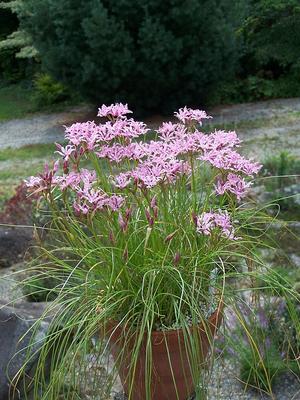 BULBSNerine masoniorum (ex: Ellen Hornig) – A dwarf-growing species, Nerine masoniorum carries its pink flowers with crinkled petals closely set atop stems about 6 to 8 inches tall waving in late season breezes above bright green grassy foliage. For us Nerine masoniorum blooms in very late August / September. Part to full sun in fertile, well-drained soil. Winter dry is crucial for many if not most South African bulbs, more so when containerized; nerines are no exception though as a group they are more forgiving than many. As with many of these South African Nerines they are slow to rise during the growing season. Patience. As with all the Nerines we offer summer moisture is a good thing within reason as long as bulbs are planted in a well-draining mix. Drier winter conidtion is advised. The addition of silica when planting may be helpful. We have found all of our Nerine fairly easy-going. Established pot grown bulb from offset or seed. Established pot grown bulb from offset or seed.