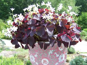BULBSOxalis regenllii 'Triangularis' (aka Oxalis triangularis) - The well-known Purple Shamrock is beautiful in borders or pots with its sharp-angled triangular leaves set in threes per leaf stem. Centers of the leaves are pink-red-purple while the edges are purple-black. Delicate clusters of funnel bell flowers are pink to lavender pink and erupt through the growing season – even longer when grown as a windowsill plant. It's easy and worthy. Plant in fertile but draining soil. Keep it drier in winter if grown indoors. Full to part sun. Full pots from divisions.