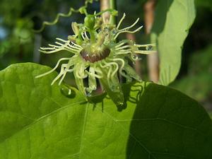 VINESPassiflora lutea – This U.S. native Passionflower with light yellow-green 1” flowers blooms for a long season: May ‘til September. Yellow Passionflower is a major food source for several species of butterfly larvae including the Julia Heliconian Butterfly. The pretty green leaves are three-pointed, virtually lobed, architectural and distinctive. With the ability to sprout from its spreading root system it is a potentially suckering vine but is said to not be aggressive. Site Passiflora lutea in part shade planted in calcareous, draining sandy loam. Spring planting is advised in the north. Pot grown by stem or root cuttings.