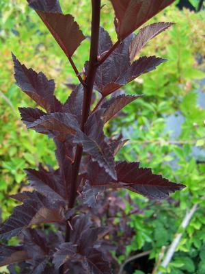 DECIDUOUS SHRUBSPhysocarpus opulifolius 'Fire and Brimstone' (EXCLUSIVE) – We evaluated for 5 years this Ninebark found as a seedling here at Quackin' Grass. 'Brimstone and Fire' lavishly displays the darkest purple-black foliage we've encountered on any cultivar. The satin finish is much darker than 'Center Glow' and even darker than both 'Diablo' and 'Summer Wine'. Foliage emerges bronze to bronze-purple, more bronze in a wet, cloudy spring; more purple in a drier, sunnier spring. As the season progresses and the days grow longer and sunnier the color gradually darkens to the blackest yet found on any Ninebark - the color in full sun holds better, longer and with virtually no bronzing. And it is key that the shrub is planted in full, blazing sun. The color is not immediate, however; The foliage matures increasingly black as the summer days grow hotter. Typical violet-pink infused white corymbs occur in abundance studding the stems and are beautiful against the blackened leaves. As the seed pods develop they turn a rich, deep, resplendent and glowering red, a really juicy shade – also beautiful against the purple-black leaves. The leaves are brimstone; the seed heads are fire. It's been difficult capturing the actual leaf color in pics... these barely do the plant justice. Site in full blazing sun for the best and darkest foliage color. We expect that in more shade the intensity of shade will diminish and become more bronzed. 'Fire and Brimstone' is adaptable to soil type. if purchased in autumn these will arrive partially pruned. Established potted Ninebark, cutting grown.