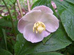 SHADE PERENNIALSPodophyllum peltatum ‘Missouri May’ – 'Missouri May' is a lovely blush pink-flowered selection of Mayapple. Each flower is held on a pedicel at the axil where the paired leaves diverge. The showy flowers can be 6 to 9-petaled and up to 3” across. Each palmately compound leaf is like a bold, deeply cut umbrella approximately 6” to 8” across. Flowers will become green fruits which expand and ripen yellow. These can be used to make a delicious jelly. ‘Missouri May’ would be well-used at the edge of the woods or in a lightly-shaded woodland setting as a ground-covering carpet with ferns on a slope, one that you would rather not mow. ‘Missouri May’ goes summer dormant. Another possibility is to companion plant ‘Missouri May’ with fall-blooming asters such as Aster divaricatus ‘Eastern Star’ which require a shady situation. The aster will take off as the Podophyllum settles into dormancy. Site in open to part shade planted in fertile draining woodland soil. This is a quick increaser. We can only imagine by its name, 'Missouri May', that this pink form of Mayapple was found in Missouri? The species originates in Eastern North America. Established potted division(s).