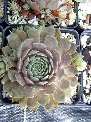 ARID LAND PLANTSSempervivum 'Pacific Blue Ice' - Evergreen rosettes are icy blue-green gray and become flushed more so with lilac-rose when cold encroaches. 'Pacific Blue Ice' will make a beautiful contrasting Hens and Chicks with other alpines, cacti and succulents or will be lovely all on its own. Put it in a pot, a rock garden, among boulders, atop a wall as edging... there are so many uses. Full sun in average to sandy, impoverished soil. Added dolomitic limestone will be beneficial. Established potted Hens and Chicks from offset.