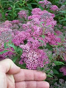 DECIDUOUS SHRUBSSpiraea x bumalda ‘Neon Flash’ – The dark green foliage is flushed with some bronze-maroon upon emerging. Corymbs of deep yet bright pink flowers, very showy, appear for a long season and great numbers in summer. Some recurrent flowering usually occurs. In autumn the foliage becomes infused with red and burgundy tones and is handsome set with any shrub with brighter autumn tones. Winter wood is sienna brown while the browned corymbs remain on the shrub. Michael Dirr lists this wonderful shrub as a cultivar of S. japonica. ‘Neon Flash’ is a lovely long blooming workhorse-of-a-shrub that would be well-used in the shrub border, as a low hedge, in the foundation garden and even as structural bones in the perennial garden. It is much ignored by gardeners - we don't sell nearly enough of these and it is so worthy. We have one growing 20 years as of 2019 placed prominently in a garden in proximity to our back deck that we view daily on our to and fro to the back part of our nursery. We love it.