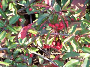 BROADLEAF EVERGREEN SHRUBSStransvaesia davidii var. undulata prostrata – This little-known shrub came our way from the now defunct Environmentals Nursery on the North Fork of Long Island (sad emoji here). This is a virtually unknown shrub to most gardeners and one that deserves great attention. Tongues of satiny dark green leaves turn a beguiling red to maroon in the autumn landscape and hang on through the winter on this virtually evergreen ground covering shrub. Flattened clusters of white May/June flowers are followed by persistent bright red pomes held in space by long arching pedicels. The shrub stands about 1-foot tall but some stems may grow taller. Though it trends horizontally in irregular fashion it will sometimes send up even taller vertical stems which may be allowed or pruned out depending upon your wishes. The extraordinary beautiful Stransvaesia davidii var. undulata prostrata deserves more attention from astute gardeners and botanic gardens. It could be fantastic on a sunny to mostly sunny slope, or utilzed as a ground covering foil facing up the larger shrub border and would be exceptional with blue conifers - those winter maroon leaves and bright red berries would set off blue-needled conifers resplendently. They are usually angular and especially odd in the pot but give them a little time... just think of the "ugly duckling" scenario... and WHAT an insult: ALLLL baby ducks are cute! Spring planting is advised in the northern end of its hardiness range. Average to fertile ground in full to part sun. Established potted shrub, cutting grown.