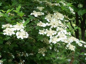 DECIDUOUS SHRUBSViburnum opulus - Good, old-fashioned European Cranberrybush Viburnum is hard to beat for copious and persistent fruit. Showy drupes of bright red fruits, each berry about one-third in diameter ripen late season and persist right through the winter here. It seems that migrating birds, ravenous in late winter/early spring on their northward journey appreciate them only after having been bletted during the long winter. We've seen Cedar Waxwings, Robins and others denuding shrubs at this time, both heart warming and entertaining. Pretty white flattened lace caps up to 4 inches in diameter adorn the shrub aplenty in May. Maple-like leaves are attractive may turn a mix of yellow, red and/or purple in autumn but more often than not the leaves drop green. We're growing 4 plants - 2 on each side of an entrance to a garden where we will, when they achieve enough height, pull them together at the top to create a living arch. Plant in fertile, draining soil sited in full to half sun. Cutting grown.