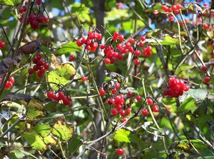 DECIDUOUS SHRUBSViburnum opulus ‘Aureum' – This form of the European Cranberrybush Viburnum has light yellow foliage. The color is soft and subtle. It holds the color fairly well through the growing season in open shade with some sun. Typical white cymes give way to red late-seasonal fruits – quite showy against the dull yellow foliage. V. o. ‘Aurea’ generally doesn’t have appreciable fall color though in some years a modest red infusion does become apparent.
