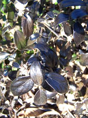 BROADLEAF EVERGREEN SHRUBSViburnum x burkwoodii ‘Conoy’ – This hybrid with V. utile (Service Viburnum) in its parentage is low-growing and mounding, wider in spread than in height. The rich green lacquer-finished obovate leaves have a pale bluish underside. They turn deep dark glossy maroon in the fall. As the autumn progresses in USDA zone 5b the outermost leaves acquire a lacquered bronze to black finish while the interior leaves remain a dark lime green. Creamy white flowers are 2” to 2.5” diameter followed by glossy egg-shaped red drupes that mature black. Regarding USDA hardiness: Though many sources indicate zone 5 hardiness in our experience we think that better success will be had in the warmer part of zone 5 (5b). 'Conoy' may settle in happily in 5a but we believe a sheltered spot in plenty of winter sun will increase chances of viability. This is a plant of great merit that will remain evergreen in warmer climes. ‘Conoy’ is small enough for a foundation garden or used as a front-of-the-border shrub facing down taller plants. A National Arboretum intro.