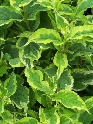 DECIDUOUS SHRUBSWeigela florida ‘Variegata Nana’ – 'Variegata Nana' is another lovely older form with gorgeous variegated leaves. Green leaves are prominently edged in butter yellow with some pink highlights. Green-centered leaves mature with creamy white-edges that look great all through the growing season. Mid to late spring flowers are a lovely light pale pastel pink. There is often very nice autumn tones. We can't understand why no one seems to want this plant. It's truly beautiful.